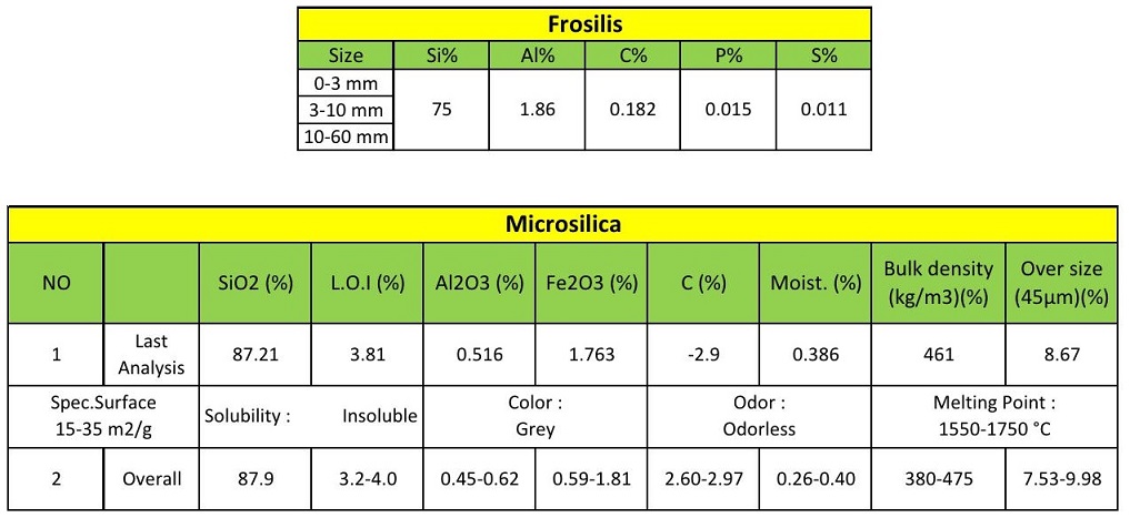 Ferro Silikon, ark fırınlarının üretiminde hammadde olarak yüksek saflıkta kuvars, odun kömürü ve demir cevheri olarak kullanılmaktadır.